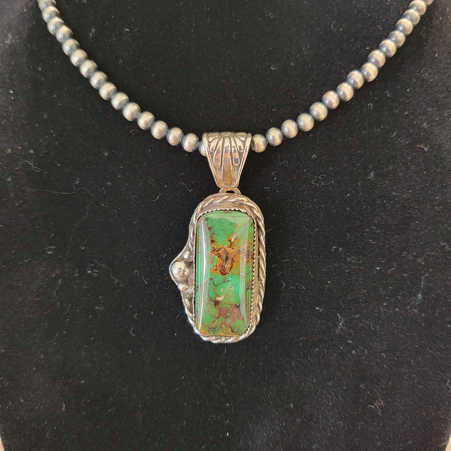 Royston Turquoise pendant surrounded by a sterling silver rope and raindrops. Royston Turquoise is found in Nevada.